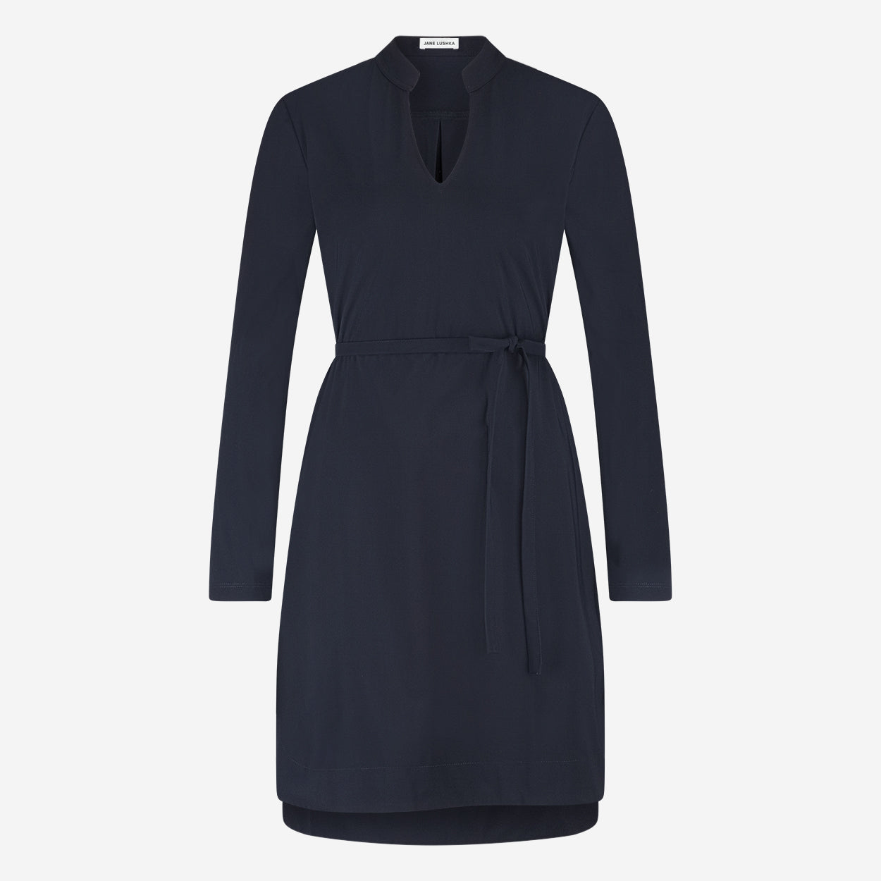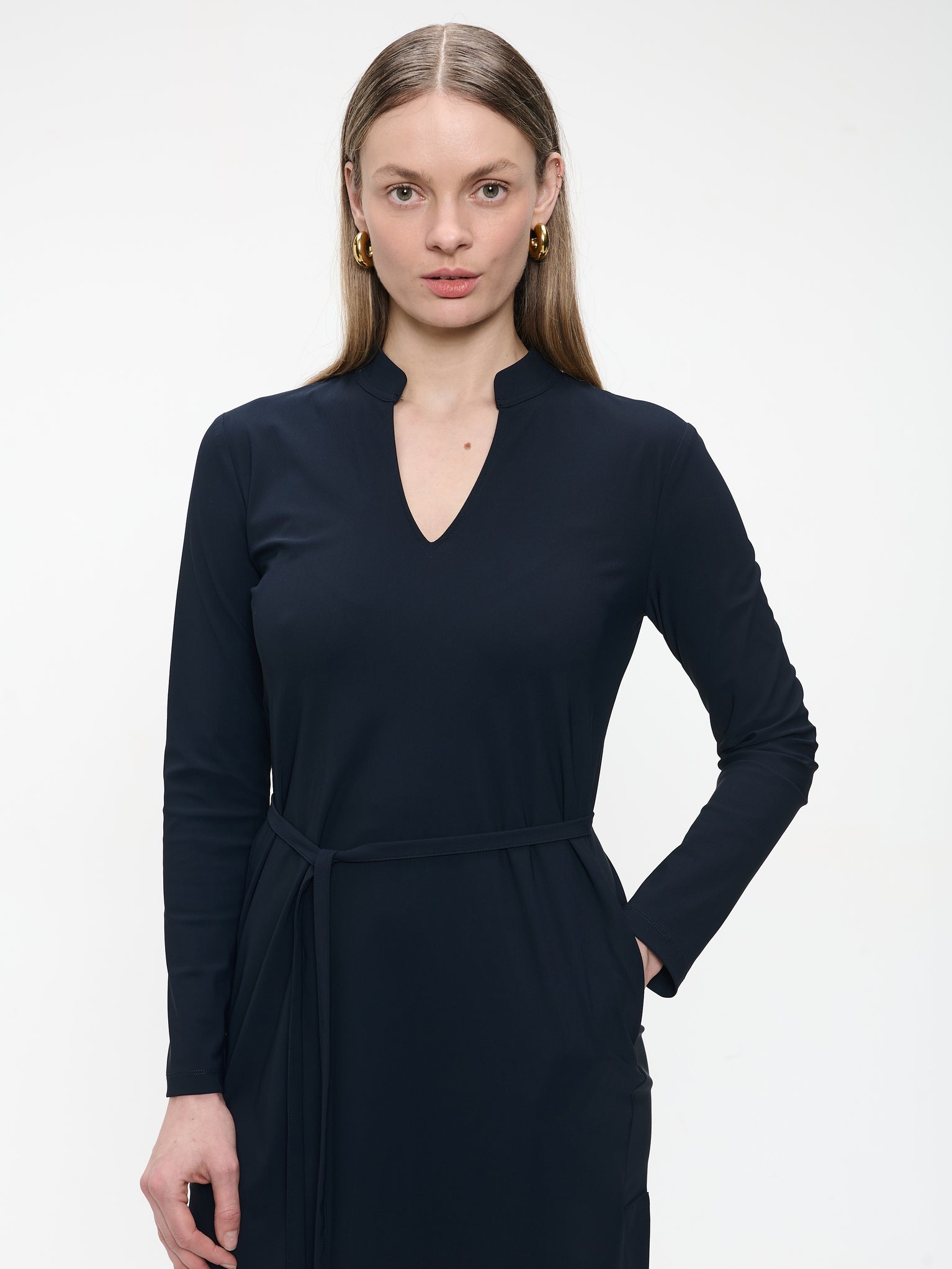 Effortlessly chic, the Gerrie Dress is your go-to for everyday elegance. Made from soft technical jersey, this long-sleeved dress combines comfort with style. The flattering V-neckline and matching waist tie enhance the feminine silhouette, while the knee-length cut keeps it versatile — perfect for both work and casual outings.