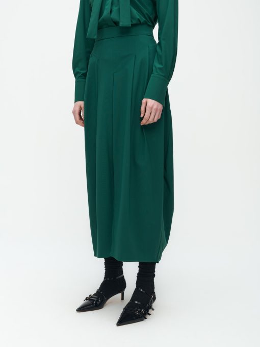The Jack skirt is a sophisticated and chic piece made from high-end Technical Jersey fabric. It features a long length, a fitted feminine silhouette with a slightly balloon fit, and riffled details.
