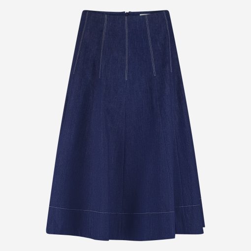 A-line denim Mishele skirt that brings together structure and femininity. The stitched pleat details add visual interest and shape, while the mid-calf length and dark indigo color provide timeless elegance. Pair it with soft knitwear or tailored shirts for versatile styling throughout the season.